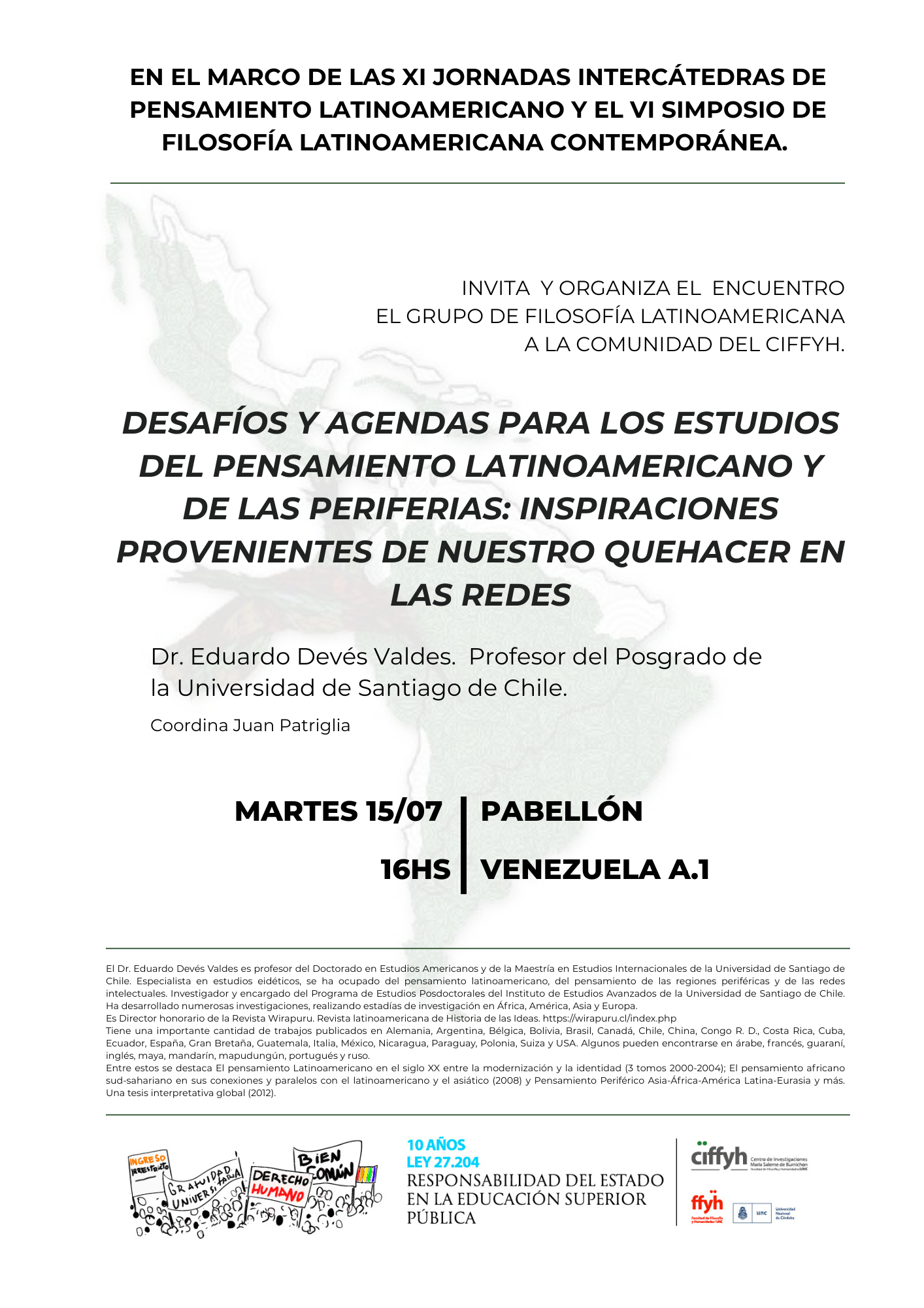 El martes 15 de julio, a las 16 hs, en el Aula 1 del Pabellón Venezuela, se realizará la charla “Desafíos y agendas para los estudios del pensamiento latinoamericano y de las periferias: inspiraciones provenientes de nuestro quehacer en las redes”, a cargo del Dr. Eduardo Devés Valdéz. Coordina: Juan Patriglia.