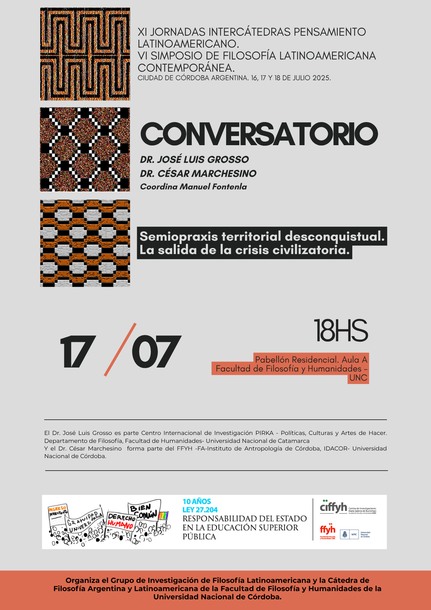 El conversatorio “Semiopraxis territorial desconquistual. La salida de la crisis civilizatoria”, a cargo de José Luis Grosso y César Marchesino, coordinado por Manuel Fontenla, se llevará a cabo el jueves 17 de julio, a las 18 hs., en el Aula A del Pabellón Residencial.