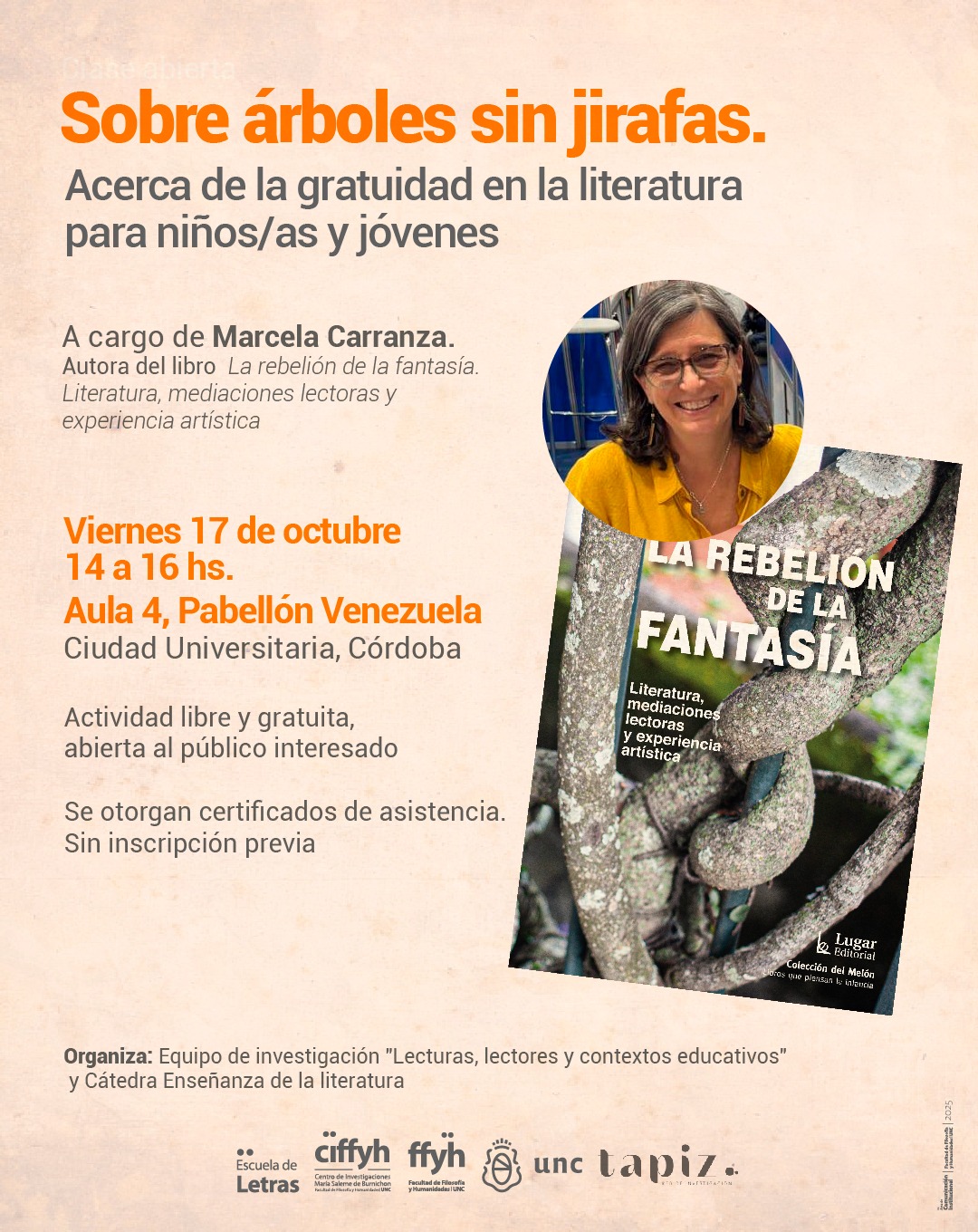 El Área de Letras del CIFFyH invita a participar de la Clase abierta: Sobre árboles sin jirafas. Acerca de la gratuidad en la literatura para niños/as y jóvenes, a cargo de la escritora Marcela Carranza, autora del libro La rebelión de la fantasía. Literatura, mediaciones lectoras y experiencia artística.