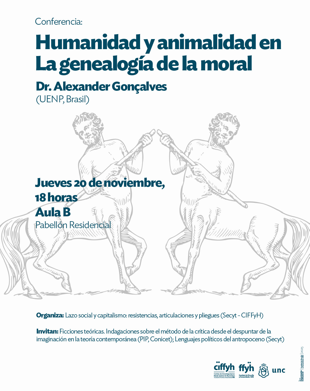 El Área Filosofía del CIFFyH invita a participar de la Conferencia: Humanidad y animalidad en La genealogía de la moral, a cargo del Dr. Alexander Gonçalves ((UENP, Brasil) que se desarrollará el 20 de noviembre a las 18 horas en el Aula B del Pabellón Residencial.