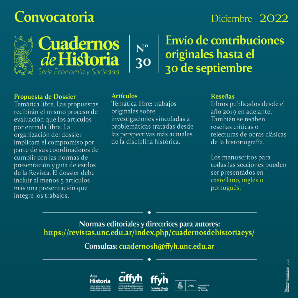 Hasta el 30 de septiembre de 2022 se reciben contribuciones para el número 30 de la publicación del Área Historia … Sigue leyendo Convocatoria de la revista Cuadernos de Historia. Serie Economía y Sociedad