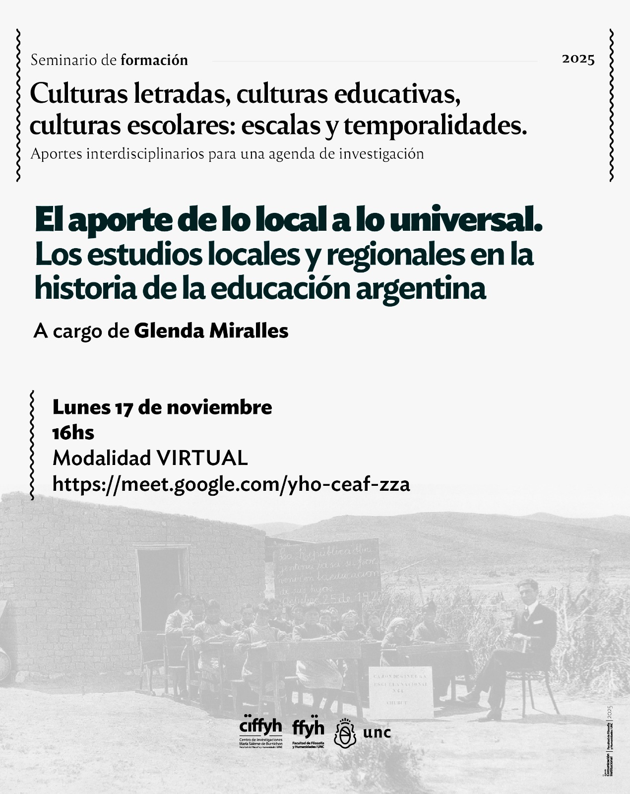 En el marco del Seminario de formación: Culturas letradas culturas educativas, culturas escolares: escalas y temporalidades. Aportes interdisciplinarios para una agenda de investigación que inició en abril, el lunes 17 de noviembre a las 15.30 horas se realizará el encuentro virtual: El aporte de lo local a lo universal. Los estudios locales y regionales en la historia de la educación argentina, a cargo de Glenda Miralles.