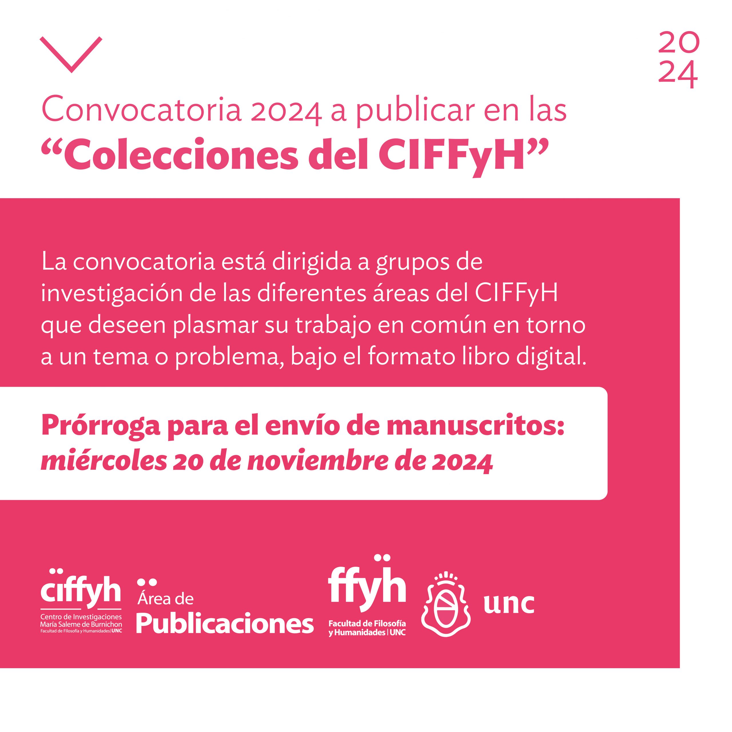 Informamos que se extiende hasta el miércoles 20 de noviembre de 2024 el plazo para presentar manuscritos para la Convocatoria 2024 de las Colecciones del CIFFyH.