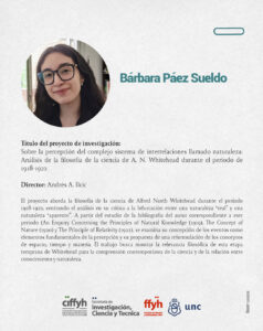 El proyecto aborda la filosofía de la ciencia de Alfred North Whitehead durante el período 1918-1922, centrando el análisis en su crítica a la bifurcación entre una naturaleza “real” y una naturaleza “aparente”. A partir del estudio de la bibliografía del autor correspondiente a este período (An Enquiry Concerning the Principles of Natural Knowledge (1919), The Concept of Nature (1920) y The Principle of Relativity (1922)), se examina su concepción de los eventos como elementos fundamentales de la percepción y su propuesta de una reformulación de los conceptos de espacio, tiempo y materia. El trabajo busca mostrar la relevancia filosófica de esta etapa temprana de Whitehead para la comprensión contemporánea de la ciencia y de la relación entre conocimiento y naturaleza.