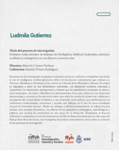 Este proyecto de investigación se propone reconstruir prácticas académicas emergentes vinculadas al uso de inteligencia artificial generativa (IAG) de estudiantes universitarios que realizan sus Prácticas y Residencias Docentes en las carreras de Ciencias de la Educación e Historia. El análisis se organizará a partir de tres dimensiones articuladas: una dimensión subjetiva, orientada a comprender las valoraciones, percepciones y criterios que los estudiantes construyen en torno a estas tecnologías, así como a identificar las preocupaciones éticas que subyacen; una dimensión epistemológica, centrada en los efectos de estos usos sobre los modos de producción, validación y apropiación del conocimiento académico; y una dimensión socio-política, que problematizará las condiciones institucionales, normativas y sociales que influyen en el uso de estas tecnologías durante la formación docente. Desde un enfoque cualitativo-interpretativo, el trabajo buscará abordar este complejo fenómeno y sus efectos en las perspectivas pedagógicas, metodológicas y políticas que asumen los estudiantes en esta etapa de su formación. Finalmente, se buscará reflexionar y sistematizar el uso de herramientas de IAG de forma documentada en cada etapa del Trabajo Final de Licenciatura, con el propósito de producir conocimiento crítico sobre su inclusión en los procesos de investigación.