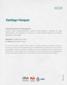La tesis busca analizar cómo la cancha produce y reproduce prácticas y sentidos de lugar que establecen, e incluso fomentan, ciertos tipos de masculinidades. La recolección de datos involucra metodologías cualitativas de registro etnográfico, entrevistas semi-estructuradas y recolección de información en redes sociales. La tesis se propone analizar la cancha desde una posicionamiento situado y entendiendo al lugar como un nodo abierto de relaciones entre lo local y lo global.