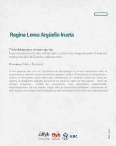 A este proyecto para tesis de licenciatura en Antropología le interesa comprender cómo se experimenta el mercado erótico virtual entre personas adultas. Entrevistando y acompañando a quienes se desempeñan como webcamers, vendedore/as de contenido audiovisual sexual y/o chatters en plataformas digitales. A través de las prácticas y redes de estos agentes —desde un enfoque etnográfico— analizo los cruzamientos entre sexualidades, subjetividades, emprendedurismo. De esta manera, indago sobre las trayectorias, habilidades y aspiraciones de estos sujetos para analizar cómo conforman un mercado erótico virtual local, y por tanto, particular.