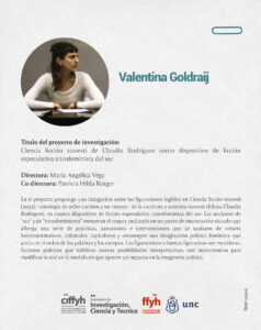En el proyecto propongo una indagación sobre las figuraciones legibles en Ciencia ficción travesti (2023) –antología de ocho cuentos y un ensayo– de la escritora y activista travesti chilena Claudia Rodríguez, en cuanto dispositivo de ficción especulativa transfeminista del sur. Las nociones de «sur» y de «transfeminismo» enmarcan el corpus analizado en un punto de enunciación situado que alberga una serie de prácticas, narraciones e intervenciones que se sustraen de corsets heteronormativos, coloniales, capitalistas y construyen una imaginación política feminista que actúa en el orden de las palabras y los cuerpos. Las figuraciones o formas figurativas son metáforas, ficciones políticas que habilitan nuevas posibilidades interpretativas; son instrumentos para modificar lo real en la medida en que ejercen un impacto en la imaginería política.