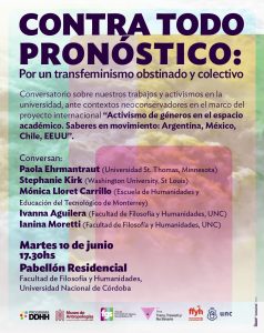 En el marco del proyecto internacional “Activismo de géneros en el espacio académico. Saberes en movimiento: Argentina, México, Chile, EEUU”, martes 10 de junio, a las 17.30hs, en el Pabellón Residencial (Ciudad Universitaria) se llevará a cabo un conversatorio sobre nuestros trabajos y activismos en la universidad, ante contextos neoconservadores.