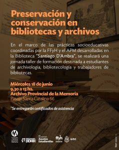 En el marco de las prácticas socioeducativas coordinadas por la Facultad de Filosofía y Humanidades y el Archivo Provincial de la Memoria desarrolladas en la Biblioteca «Santiago D’Ambra», el miércoles 18 de junio, de 9,30 a 13hs en el APM (Pasaje Santa Catalina 66), se realizará una jornada taller de formación destinada a estudiantes de …