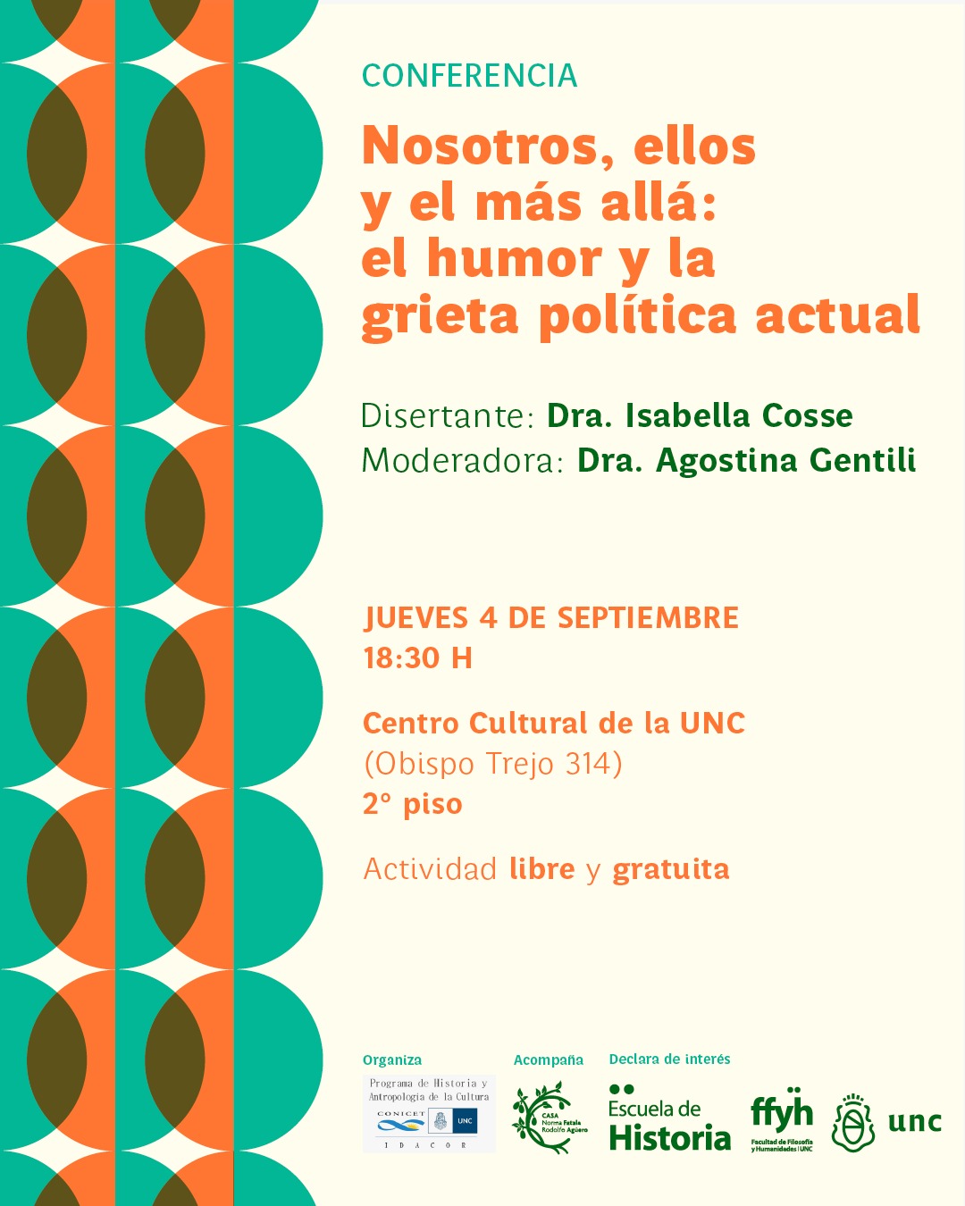 La actividad es organizada por el Programa de Historia y Antropología de la Cultura (IDACOR CONICET UNC), con aval de la Escuela de Historia (FFYH) y acompañamiento de la Casa Fatala-Agüero.