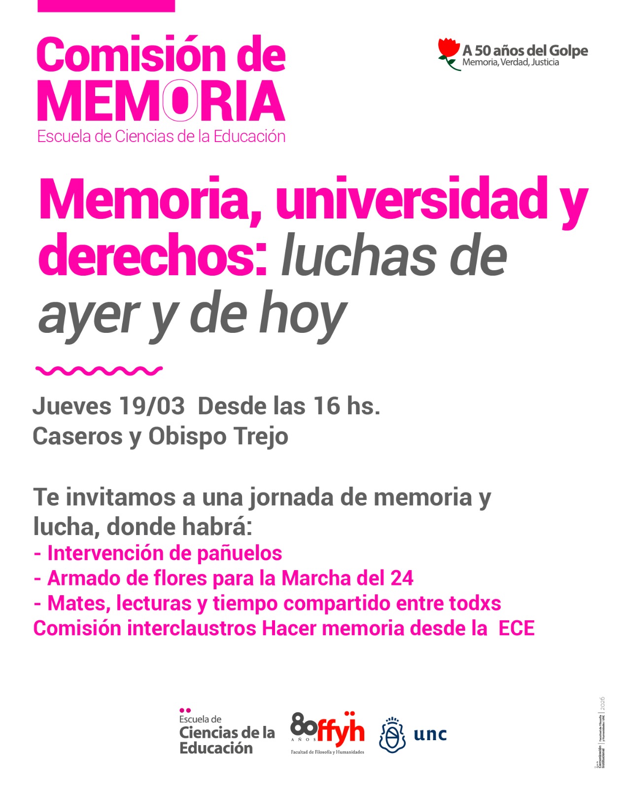 Este espacio de encuentro para pensar las relaciones entre memoria, universidad pública y luchas colectivas, se llevará a cabo el jueves 19 de marzo, a las 16 hs., en Caseros y Obispo Trejo.