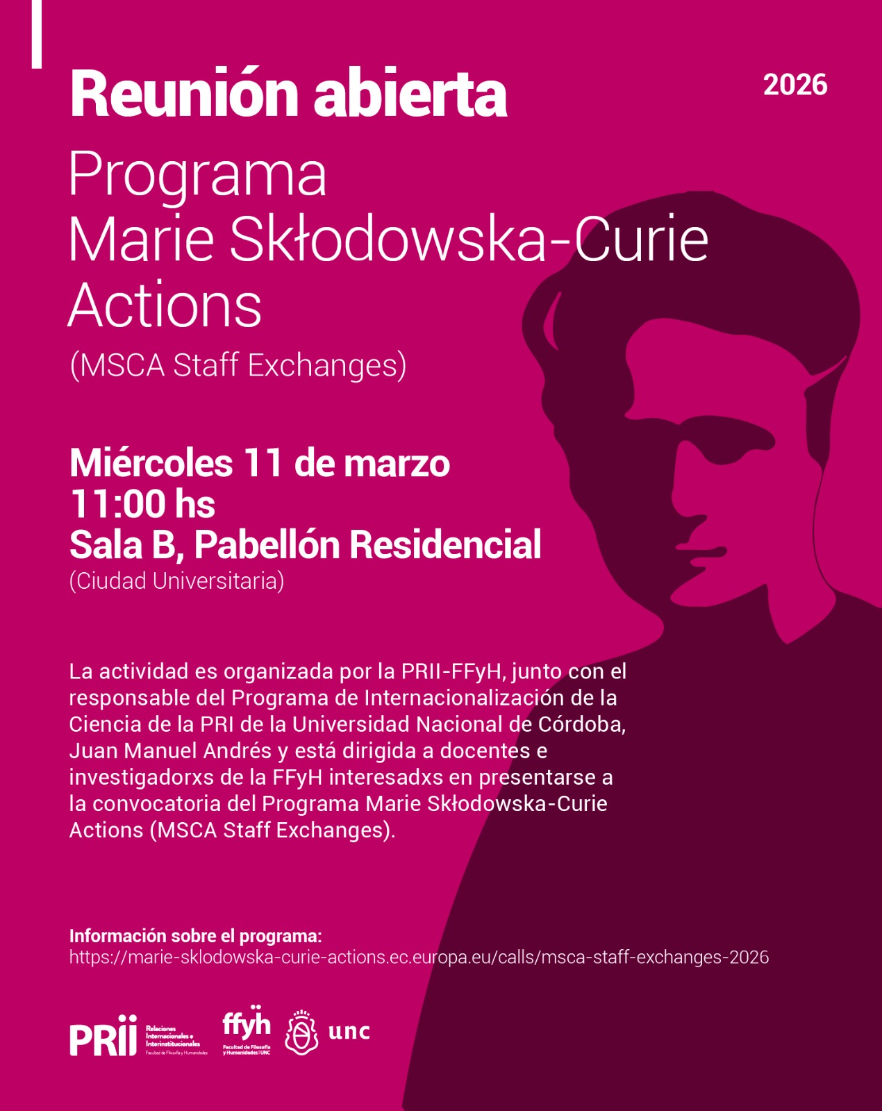 Es organizada por la PRII-FFyH, junto con el responsable del Programa de Internacionalización de la Ciencia de la PRI de la Universidad Nacional de Córdoba, Juan Manuel Andrés y está dirigida a docentes e investigadorxs de la FFyH interesadxs en presentarse a la convocatoria del Programa Marie Skłodowska‑Curie Actions (MSCA Staff Exchanges).