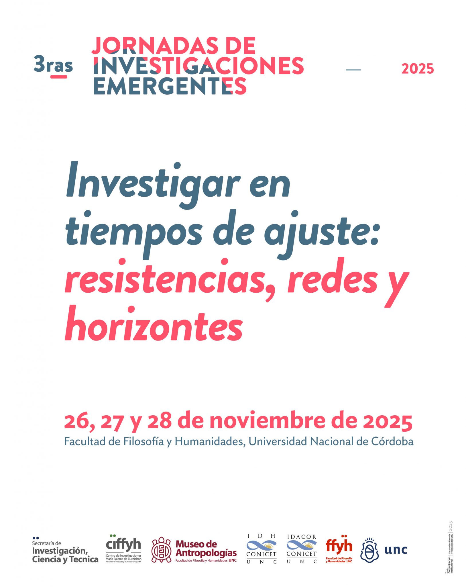 El CIFFyH, la SEICyT, el Museo de Antropologías, el IDH y el IDACOR invitan a participar de las Terceras Jornadas de Investigaciones Emergentes: Investigar en tiempos de ajuste: resistencias, redes y horizontes que se realizarán los días 26, 27 y 28 de noviembre de 2025 en la Facultad de Filosofía y Humanidades.