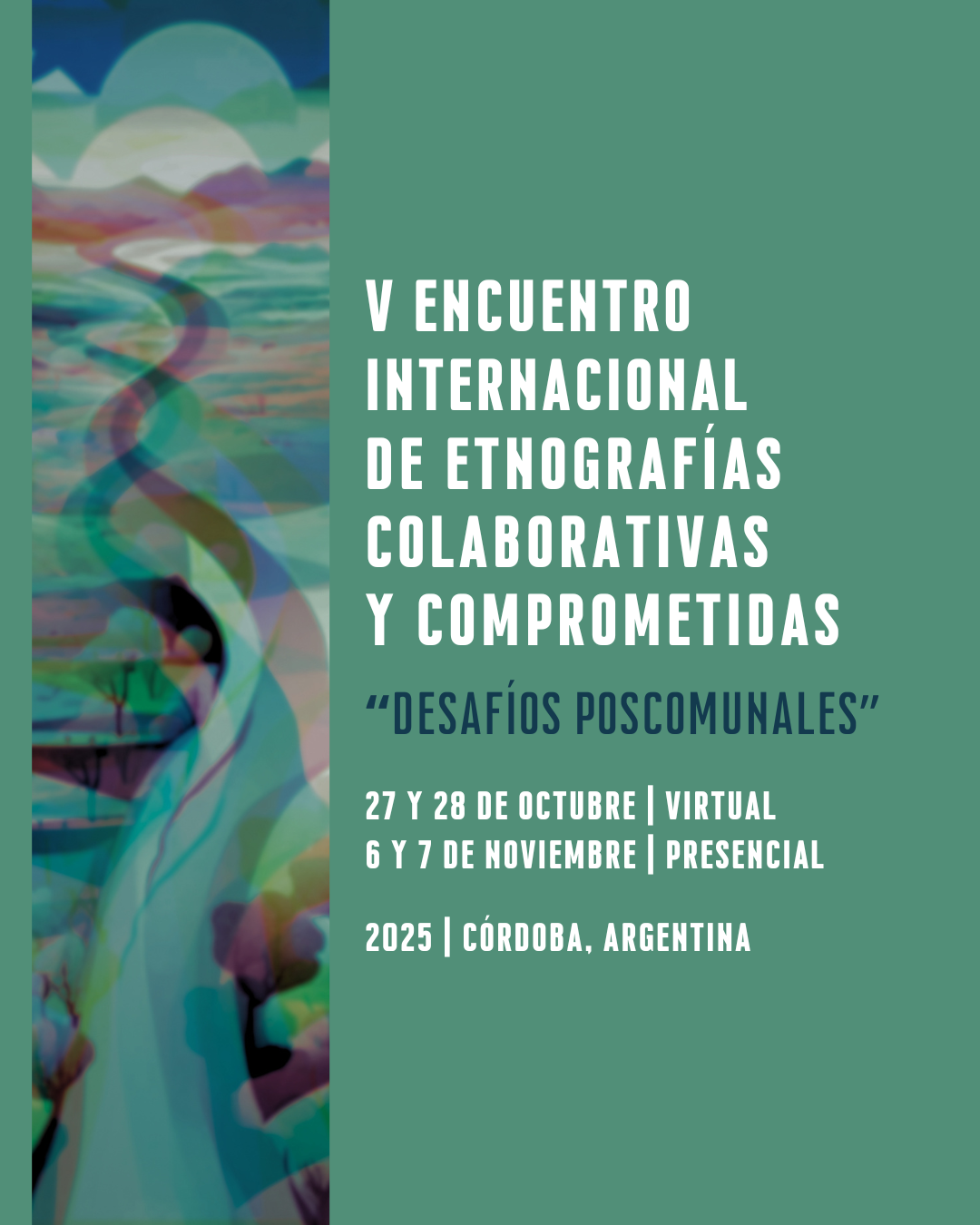 Se encuentra abierta la recepción de resúmenes para el V Encuentro Internacional de Etnografías Colaborativas y Comprometidas, que se celebrará los días 27 y 28 de octubre de manera virtual, y 6 y 7 de noviembre de manera presencial, en el Museo de Antropologías / IDACOR y la Facultad de Filosofía y Humanidades de la UNC, Córdoba.