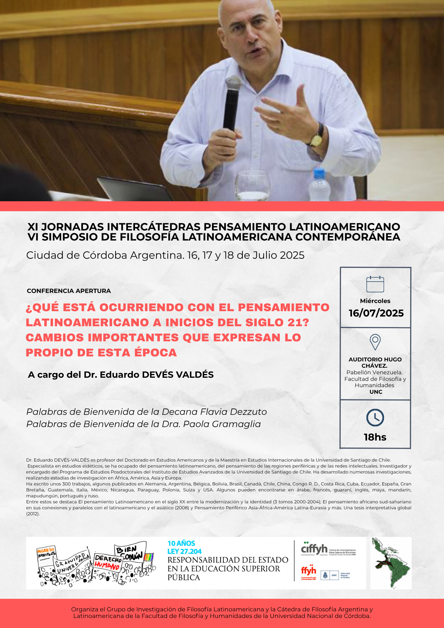 La conferencia de apertura “¿Qué está ocurriendo con el pensamiento latinoamericano a inicios del siglo 21? Cambios importantes que expresan lo propio de esta época”, a cargo del Dr. Eduardo Devéz Valdéz, será el miércoles 16 de julio, a las 18 hs, en el Auditorio Hugo Chávez del Pabellón Venezuela.
