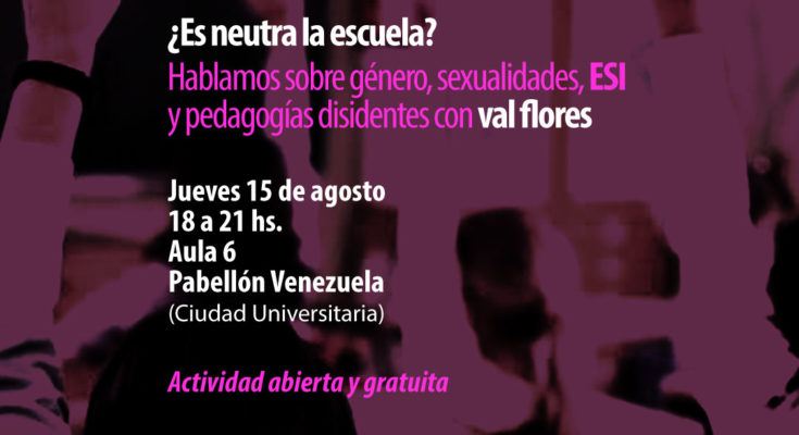 La Dirección y el Consejo de la Escuela de Ciencias de la Educación invitan a participar del Ateneo “Educación, Género y Feminismos. ¿Es neutra la escuela?» (Hablamos sobre género, sexualidades, ESI y pedagogías disidentes con val flores) a realizarse el día jueves 15 de agosto, de 18 a 21 hs., en el Aula 6 del Pabellón Venezuela (Ciudad Universitaria).