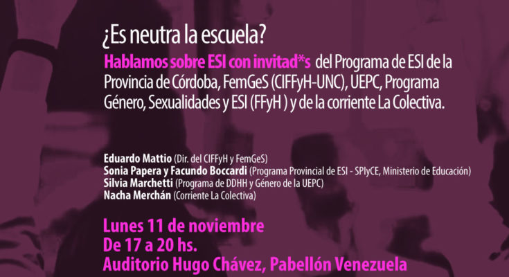 En esta ocasión se hablará sobre ESI con invitad*s del Programa de ESI de la Provincia de Córdoba, de FemGeS (CIFFyH UNC), UEPC, el Programa Género, Sexualidades y Educación Sexual Integral de la FFyH y de la corriente La Colectiva.