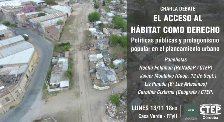 El lunes 13 de noviembre, a las 18 hs, en el Aula 10 de Casa Verde (Ciudad Universitaria) se llevará a cabo la Charla-debate «El acceso al hábitat como derecho. Políticas públicas y protagonismo popular en el planeamiento urbano». La actividad es organizada por miembros de la Carrera de Geografía en articulación con la Confederación de Trabajadores de la Economía Popular (CTEP-Córdoba).