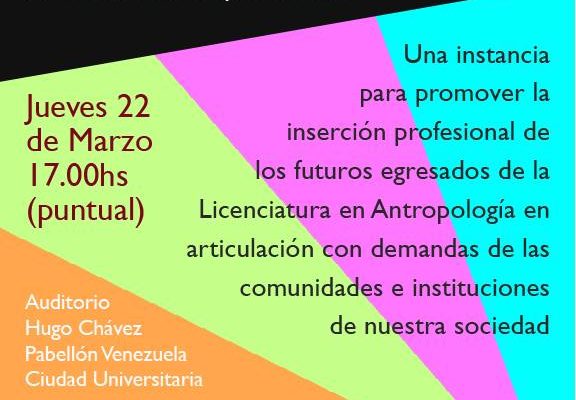 El jueves 22 de marzo, a las 17 hs, en el Auditorio Hugo Chávez del Pabellón Venezuela se llevará a cabo una charla informativa sobre Practicas Profesionales Supervisadas para lxs estudiantes del Departamento de Antropología.