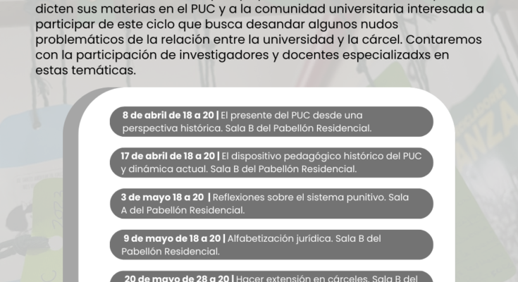 Se encuentra abierta la tercera edición del «Ciclo de Formación. Derechos Humanos en Contextos de Encierro», que comienza el lunes 8 de abril, destinado a ayudantes, adscriptes, cátedras que estén trabajando en el PUC y a la comunidad universitaria interesada en la temática, con el objetivo de desandar los principales nudos problemáticos relativos al trabajo universitario en cárceles.