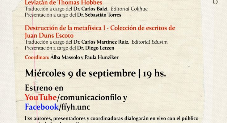 Organizado por el Área de Filosofía del CIFFyH y la Escuela de Filosofía, el estreno del encuentro virtual se realizará el miércoles 9 de septiembre, a las 19 hs, por el canal de YouTube https://www.youtube.com/user/comunicacionfilo y el Facebook de la FFyH: https://www.facebook.com/ffyh.unc/