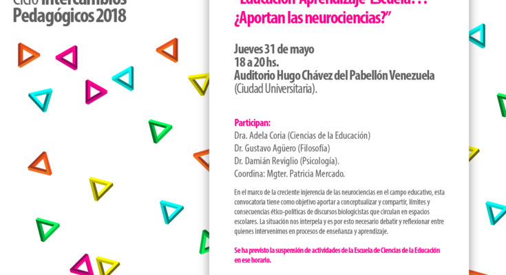 La Dirección de la Escuela de Ciencias de la Educación invita a estudiantes, docentes, egresados e interesados en la temática, a participar en el panel- debate “Educación-Aprendizaje-Escuela… ¿Aportan las neurociencias?”, que se desarrollará en el marco del Ciclo “Intercambios Pedagógicos” el día jueves 31 de mayo, de 18 a 20 hs., en el Auditorio Hugo Chávez del Pabellón Venezuela (Ciudad Universitaria).