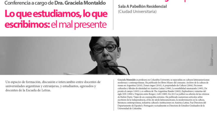 El martes 14 de agosto, a las 18 hs., en la Sala A del Pabellón Residencial (Ciudad Universitaria), se realizará el tercer encuentro del Ciclo Profesor Invitado, organizado por la Escuela de Letras, la Oficina de Graduadxs y la Secretaría de Asuntos Estudiantiles de la FFyH. En esta oportunidad, Graciela Montaldo brindará la conferencia “Lo que estudiamos, lo que escribimos: el mal presente”.