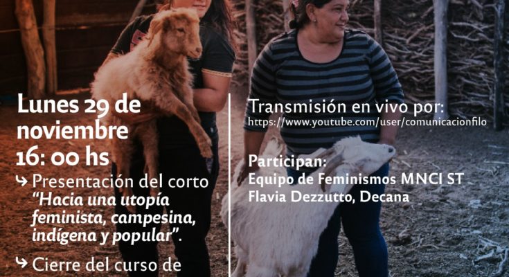 El lunes 29 de noviembre, a las 16 hs, en vivo por el canal de Youtube de la FFyH: https://www.youtube.com/user/comunicacionfilo se llevará a cabo el cierre del curso de Economía Feminista y la presentación del corto «Hacia una utopía feminista campesina, indígena y popular». Participarán el Equipo de Feminismos del Movimiento Nacional Campesino Indígena Somos Tierra y la Decana, Flavia Dezzutto.
