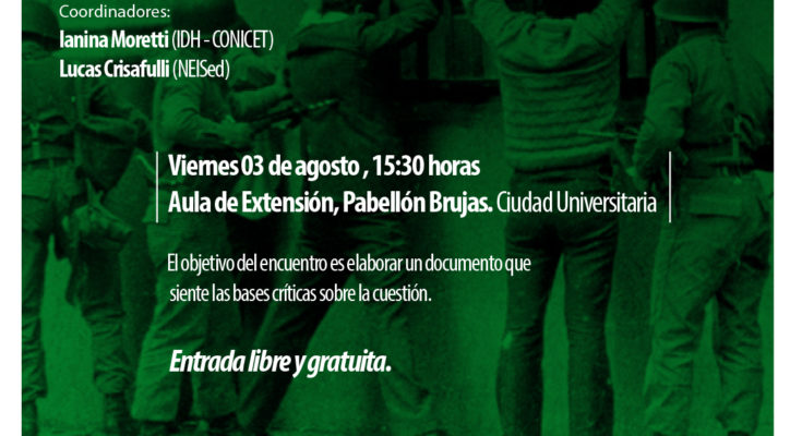 Organizado por el Núcleo de Estudios e Intervención en Seguridad Democrática del Programa de Derechos Humanos, el viernes 03 de agosto, a las 15:30 hs, en el Aula de Extensión del Pabellón Brujas (Ciudad Universitaria), se llevará a cabo el Conversatorio Taller “Fuerzas Armadas en la calle Nunca Más”, coordinado por Ianina Moretti y Lucas Crisafulli.