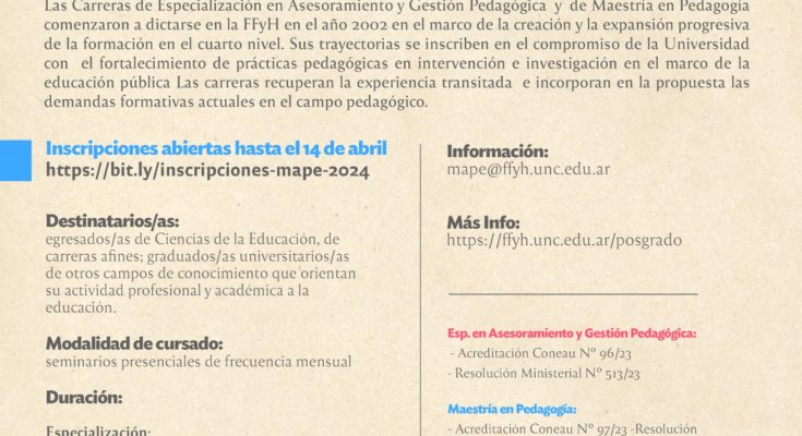 Las carreras de Posgrado de la FFyH Especialización en Asesoramiento y Gestión Pedagógica y Maestría en Pedagogía, informan a docentes, egresados/as y público interesado que hasta el 14 de abril se abre la convocatoria de cursado 2024. El inicio será a partir del mes de mayo, con planes y reglamentos aprobados por CONEAU y Ministerio de Educación de la Nación.