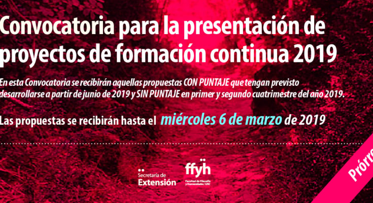 La Secretaría de Extensión de la FFyH informa que se encuentra abierta la Convocatoria para la presentación de proyectos de formación continua CON y SIN PUNTAJE docente a desarrollarse durante el 2019. La fecha de recepción de los mismos es miércoles 6 de marzo.