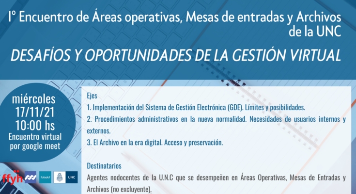 Organizado por el Área Operativa y Mesa de Entradas de la FFyH, el Archivo del CEA de la Facultad de Ciencias Sociales y el Archivo y Mesa de Entradas de FAMAF, se realizará el miércoles 17 de noviembre de 2021, a las 10 hs.
