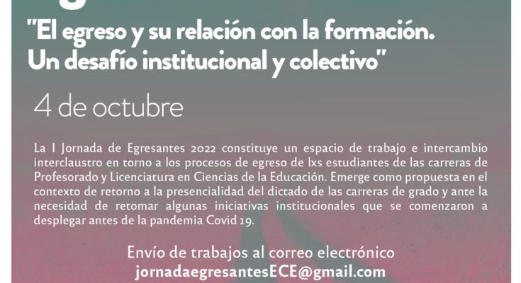 La I Jornada de Egresantes 2022, que se llevará a cabo el 4 de octubre de 2022, constituye un espacio de trabajo e intercambio interclaustro en torno a los procesos de egreso de lxs estudiantes de las carreras de Profesorado y Licenciatura en Ciencias de la Educación. Emerge como propuesta en el contexto de retorno a la presencialidad del dictado de las carreras de grado y ante la necesidad de retomar algunas iniciativas institucionales que se comenzaron a desplegar antes de la pandemia Covid 19.