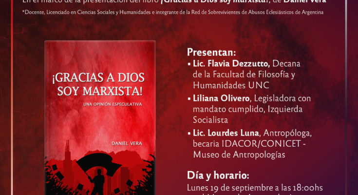 El lunes 19 de septiembre, a las 18 hs, en el Museo de Antropologías de la UNC, se llevará a cabo el conversatorio “Iglesia y Estado: asuntos pendientes” donde participarán: Flavia Dezzutto, decana de la Facultad de Filosofía y Humanidades de la UNC; Liliana Olivero, legisladora mandato cumplido del partido Izquierda Socialista y Lourdes Luna, antropóloga y becaria de IDACOR-Conicet. En este marco, se presentará el libro ¡Gracias a Dios soy marxista! Una opinión especulativa, de Daniel Vera, integrante de la Red Argentina de Sobrevivientes de Abusos Eclesiásticos.