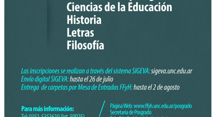 La Secretaría de Posgrado de la FFyH informa que se encuentran abiertas las inscripciones para las carreras de Doctorado en Ciencias Antropológicas, en Ciencias de la Educación, en Historia, en Letras y en Filosofía hasta el 26 de julio, a través del sistema SIGEVA: sigeva.unc.edu.ar.