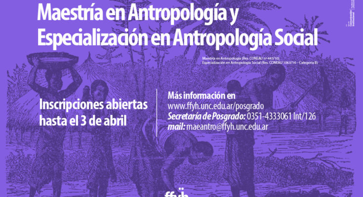 La Secretaría de Posgrado de la Facultad de Filosofía y Humanidades (UNC) informa que hasta el 3 de abril estarán abiertas las inscripciones para las carreras de Maestría en Antropología y Especialización en Antropología Social.
