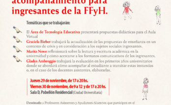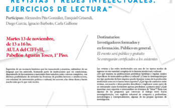 13/11/2018 @ 1:00 pm – 4:00 pm – En el marco del ciclo “El Oficio de investigar”, el martes 13 de noviembre, de 13 a 16 hs, en el Aula del CIFFyH (Pabellón Agustín Tosco, Ciudad Universitaria), se realizará el conversatorio “Revistas y redes intelectuales. Ejercicios de lectura”, con la participación de Alexandra Pita González, Ezequiel Grisendi, Diego García, Ignacio Barbeito y Carla […]
