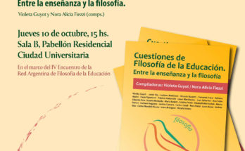 10/10/2019 @ 3:00 pm – 5:00 pm – El evento tendrá lugar en La Falda, del 10 al 12 de octubre, y en ese marco se presentará el libro “Cuestiones de la Filosofía de la Educación. Entre la enseñanza y la filosofía”, cuyas compiladoras son Violeta Guyot y Nora Alicia Fiezzi, en la Facultad de Filosofía y Humanidades de la UNC.