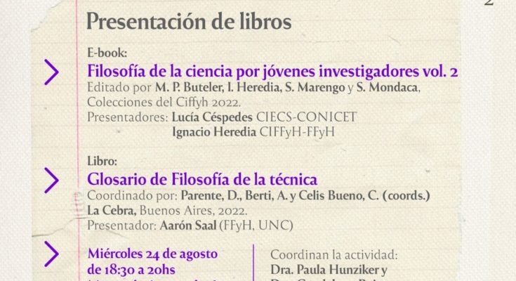 - Libro: Glosario de Filosofía de la técnica coordinado por Parente, D., Berti, A. y Celis Bueno, C., La Cebra, Buenos Aires, 2022. Presentador: Aarón Saal (FFyH, UNC)