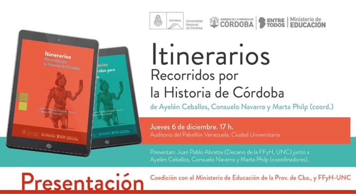 La presentación del libro “Itinerarios. Recorridos por la Historia de Córdoba”, de Ayelén Ceballos, Consuelo Navarro y Marta Philp (coord), tendrá lugar el día jueves 6 de diciembre, a las 17 hs, en el Auditorio del Pabellón Venezuela, (Ciudad Universitaria), con la presencia de las coordinadoras, junto a Juan Pablo Abratte (Decano de la Facultad de Filosofía y Humanidades).