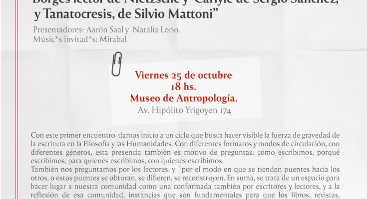 Con este primer encuentro se da inicio a un ciclo que busca hacer visible la fuerza de gravedad de la escritura en la Filosofía y las Humanidades. Con diferentes formatos y modos de circulación, con diferentes géneros, esta presencia también es motivo de preguntas: cómo escribimos, porqué escribimos, para quienes escribimos, con quienes escribimos. También nos preguntamos por los lectores, y por el modo en que se tienden puentes hacia los otros, o estos puentes se obturan, se difieren, se reconstruyen.