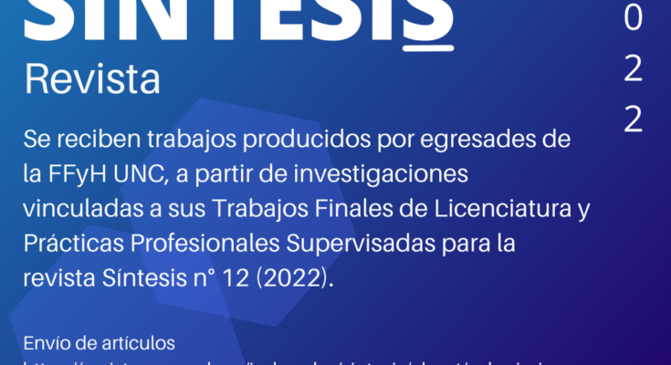 La Secretaría de Investigación, Ciencia y Técnica y la Secretaría Académica de la FFyH comunican que se reciben, de forma permanente, trabajos para la revista Síntesis producidos por egresades de la Facultad de Filosofía y Humanidades, a partir de las investigaciones vinculadas a sus Trabajos Finales de Licenciatura y Prácticas Profesionales Supervisadas.