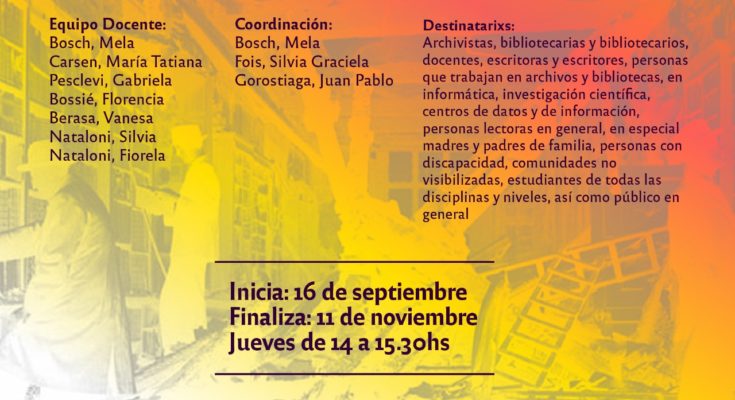 Destinatarixs: Archivistas, bibliotecarias y bibliotecarios, docentes, escritoras y escritores, personas que trabajan en archivos y bibliotecas, en informática, investigación científica, centros de datos y de información, personas lectoras en general, en especial madres y padres de familia, personas con discapacidad, comunidades no visibilizadas, estudiantes de todas las disciplinas y niveles, así como público en general.
