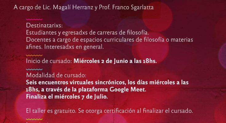 El Taller está destinado a estudiantes y egresadxs de carreras de Filosofía, docentes a cargo de espacios curriculares de filosofía o materias afines e interesadxs en general.