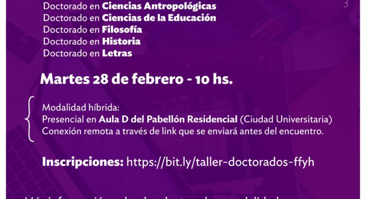 La Secretaría de Posgrado brindará un taller para aspirantes a las carreras de Doctorado que se dictan en la Facultad de Filosofía y Humanidades de la UNC: Ciencias Antropológicas – Doctorado en Ciencias de la Educación – Doctorado en Filosofía – Doctorado en Historia – Doctorado en Letras.