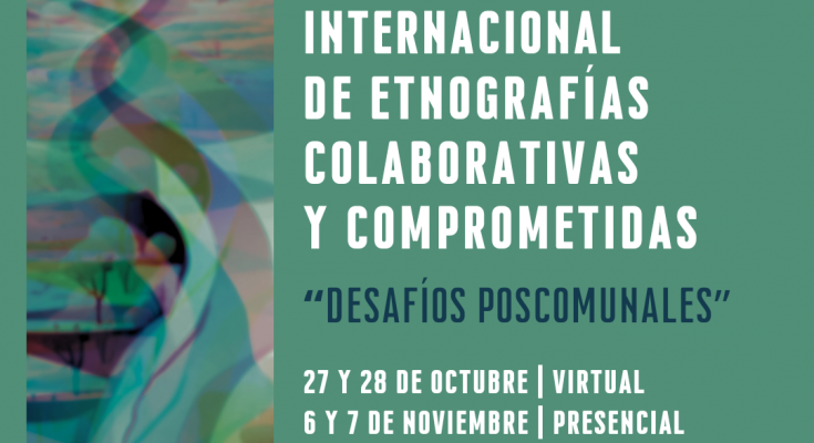 Se encuentra abierta la recepción de resúmenes para el V Encuentro Internacional de Etnografías Colaborativas y Comprometidas, que se celebrará los días 27 y 28 de octubre de manera virtual, y 6 y 7 de noviembre de manera presencial, en el Museo de Antropologías / IDACOR y la Facultad de Filosofía y Humanidades de la UNC, Córdoba.