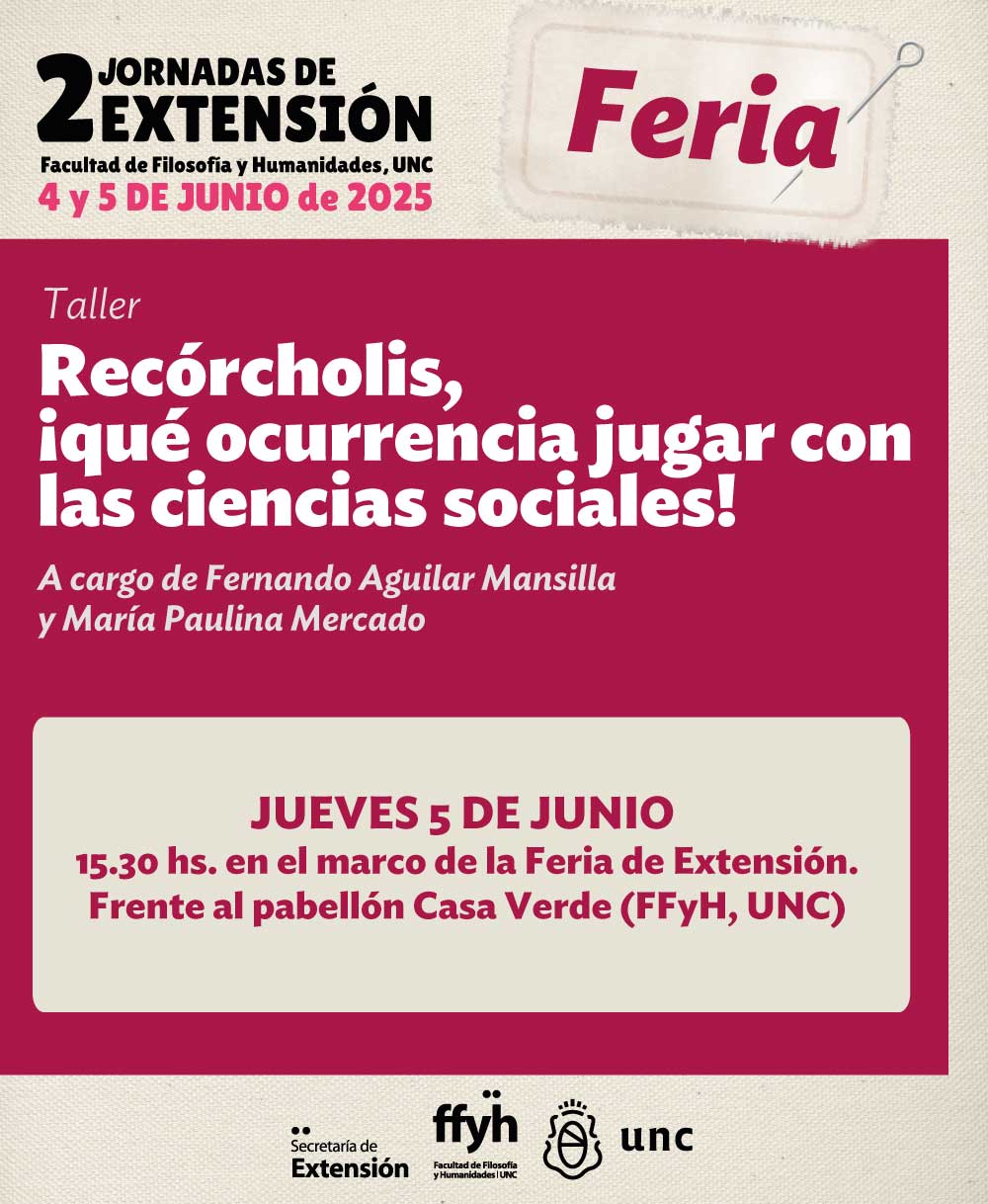 El taller a cargo de Fernando Aguilar Mansilla y María Paulina Mercado, será el jueves 5 de junio a las 15.30 hs. en el marco de la Feria de Extensió que se desarrollará frente al pabellón Casa Verde (FFyH, UNC).