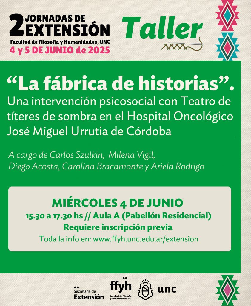 👉 El taller se propone como un espacio de montaje y desmontaje de una experiencia de taller de títeres transitada junto a un grupo de pacientes en el hospital oncológico de córdoba. En tal sentido, se proponen generar condiciones para que los asistentes transiten una experiencia concreta relacionada con el uso social del teatro de títeres en procesos de intervención extensionista.