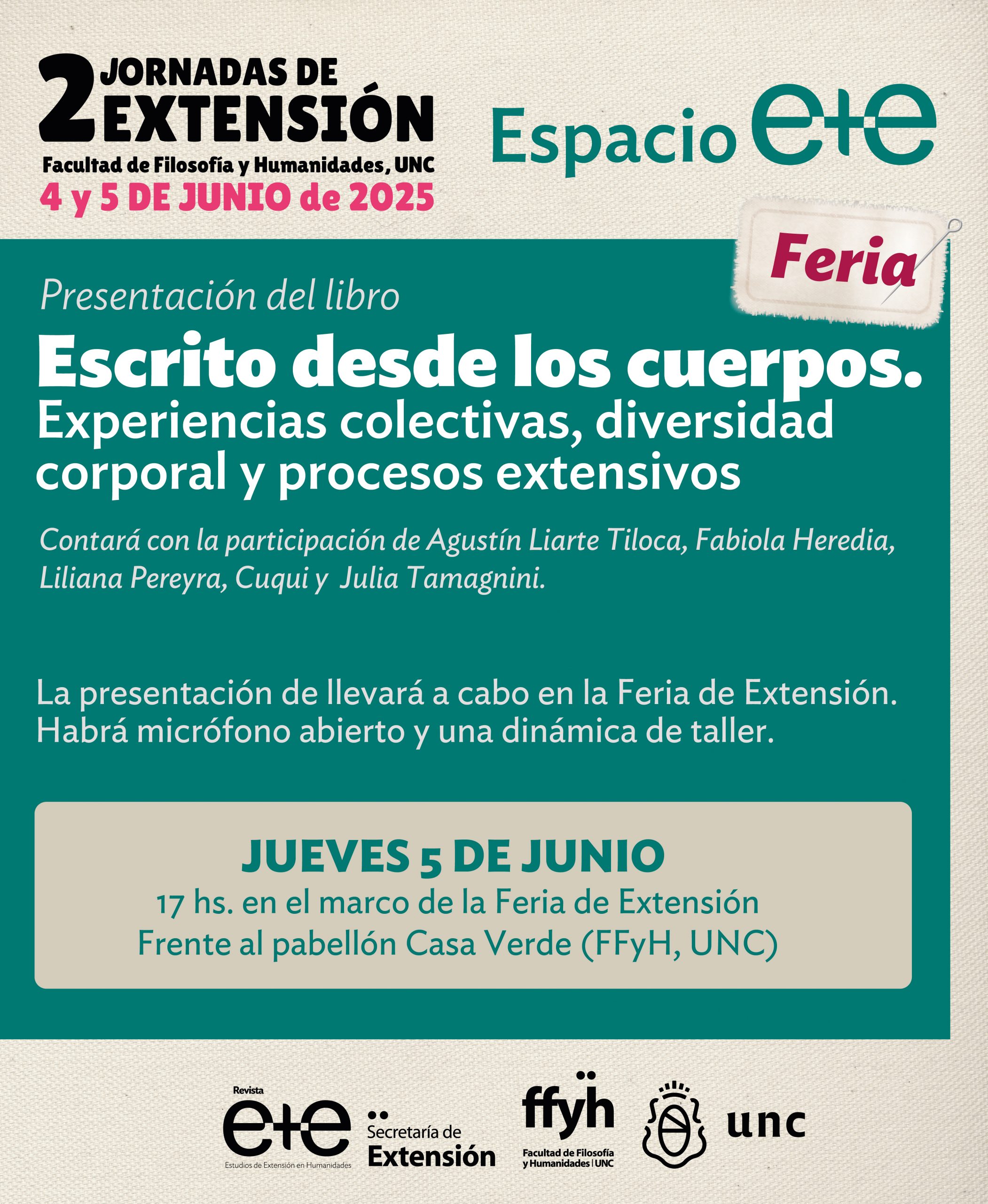 La presentación será el jueves 5 de junio a las 17 hs. en el marco de la Feria Extensionista frente al Pabellón Casa Verde. Se enmarca dentro del espacio que la Revista e+e tiene dentro de las Jornadas y que busca problematizar las diferentes modalidades de escritura en extensión.